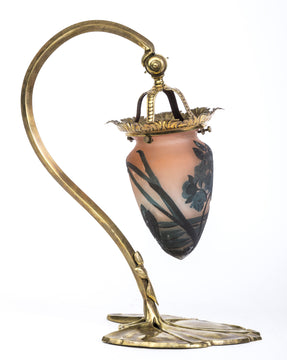 This exquisite Émile Gallé table lamp is engraved "Calthas Marsh." It features a chiseled gilt bronze base with stylized leaf motif, with a frosted conical shade embellished in mint leaf detailing. Shade in acid etched and wheel carved glass