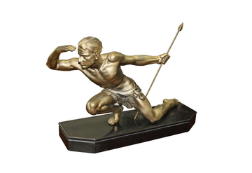 French Art Deco patinated petit bronze sculpture of a Hunter on black marble base by Jean de Roncourt.
