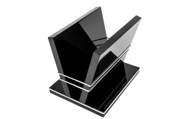 This elegant French Art Deco newspaper stand / magazine rack features a high gloss black lacquer finish with chrome-line detailing.