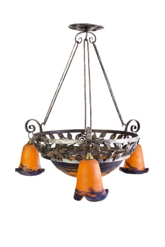 This beautiful Art Deco chandelier was designed and executed by Degue. It features a hand forged wrought iron base with stylized leaf detailing and floral shaped glass shades in hues of black, amber, sand, & gold.