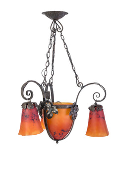 This magnificent early French Art Deco Chandelier was designed and signed by Charles Schneider. It features a hand wrought iron base with floral design, and (3) beautiful crimson glass shades.