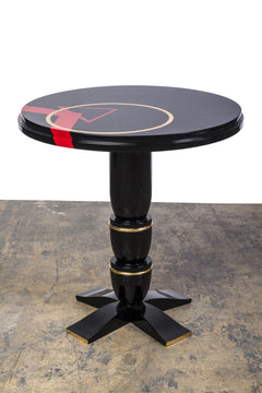 This unique Art Deco side / center table features a unique geometric design in red lacquer and gold leaf top, black lacquer finishing, and gold leaf details.