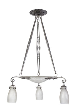 This stunning French Art Deco chandelier is made out of silvered wrought iron attributed to Edgar Brandt with acid-etched glass shades signed Daum-Nancy.