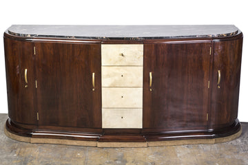 Elegant mahogany French Art Deco Sideboard is signed by Maurice Rinck. It features a black Portoro marble top, parchment clad drawers in the center and rounded corner doors with bronze hardware.