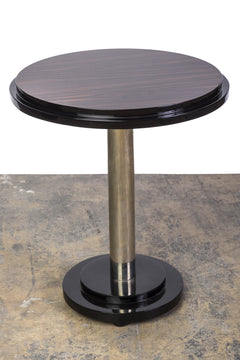This beautiful streamlined design Art Deco occasional / side side table features a Macassar top, nickel plated metal structure and a black lacquered base