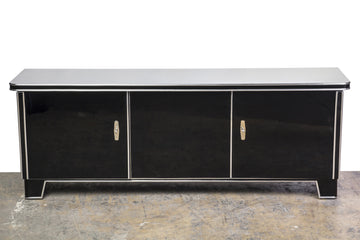 This magnificent Art Deco low board features (2) swing doors, chrome-lines & fixtures, and finished in a high gloss black lacquer. The pieces has a Lacobel glass top plate.