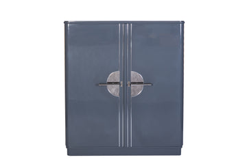 This marvelous 1940’s Art Deco cabinet features chrome lines & fixtures with two (2) swing doors, finished in a high gloss slate lacquer.