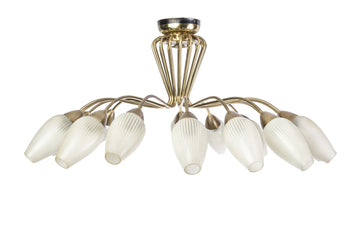 This beautiful French Sputnik chandelier features a Spider form frame composed of brass. It has sixteen (16) lights surrounded by frosted glass conical form pinstriped shades.
