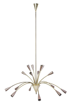 This unique 1950's Mid-Century modernist sputnik features a brass frame with (16) tentacle form conical lights extending from the base.