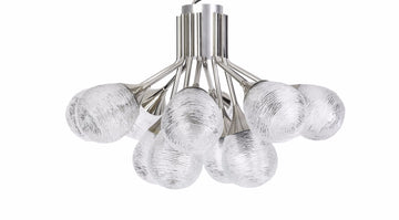 This luxe Mid-Century Modernist Sputnik chandelier, features twelve (12) ribbed textured glass bulbs descending from a chrome frame creating a orbital form design.