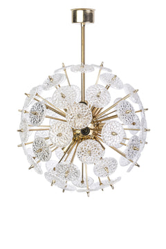This exquisite Mid-Century Modernist floral Sputnik was created by the prolific Val Saint Lambert. It features twelve (12) lights, on a starburst design form in brass with stylized floral cut crystal discs surrounding the base. It has been newly rewired and it is in excellent condition.