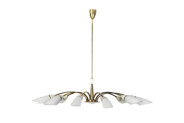 This gorgeous Italian 1950's chandelier was designed by Stilnovo. It features a spider form design brass frame with 12 double-layer blown opal glass shades and a white enamel center piece.
