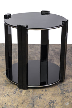 This gorgeous Art Deco side table features a cylindrical shape design with chrome lines, and an embedded top plate finished in a beautiful high gloss black lacquer.