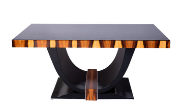 This exceptional French Art Deco style dining table features a burled Macassar wood detail on the sides and base of this table. It has a sloped base with a French foot, finished in a high gloss black lacquer.