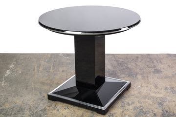 This gorgeous Art Deco side table features a round top protected by a Lacobel glass on a pedestal column and a pyramid shaped base with chrome-line detailing and finished in a high gloss black lacquer.