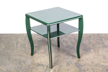 This gorgeous Art Deco side table features a square form design with cabriole legs and chrome detailing with a moss high gloss lacquer finish.