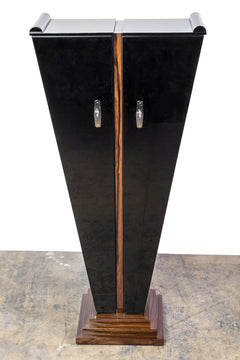 This impressive Art Deco bar was designed by Elien Chopardt. It features a tulip shape with two (2) swing doors giving it a fan shape made of beautiful rosewood. It has chromed fixtures & detailing with a gorgeous high gloss black lacquer finish.