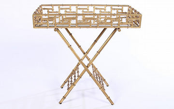 This beautiful bar tray features a gilt metal bamboo design mixing table with a distressed mirrored surface resting on an X-form base.