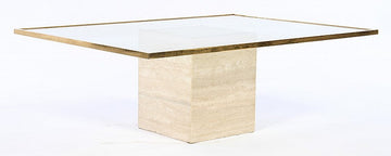This beautiful Mid-Century Modernist coffee table features a square glass top with brass detailing supported by a central travertine cube with bronze mirror finishes and brass trim.