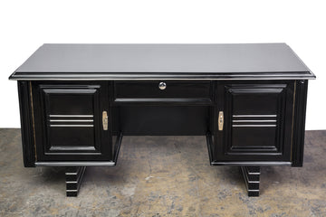 This magnificent Art Deco desk features two (2) swing doors with chrome lines & fixtures on a floating base design and a side to side shelve on the opposite side for display. Finished in a luscious high gloss black lacquer. Interiors in crimson matte lacquer.