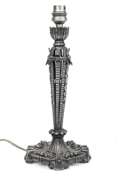 This gorgeous 1930's Art Deco table lamp was designed in the style of Edgar Brandt. It features an iron frame with intricate sculptural floral motif detailing and a beautiful tapered form. The lamp is in excellent condition. Foundry mark "Made in France, Paris 592"