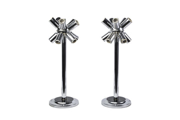 This superb pair of 1970's Mid-Century Modernist sputnik table lamps feature an atomic form design on a chrome frame that holds (10) standard base globe bulbs each.