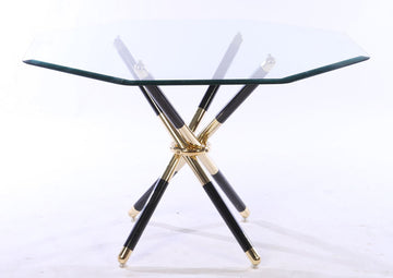 Beautiful center / dining table with collapsible leg made out of enameled and brass plated metal and glass top.