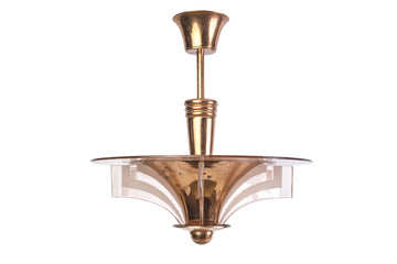 This stunning French Art Deco chandelier by Petitot is trumpet form in copper and salmon colored glass accents and plate. Matching sconces ref. ada00414