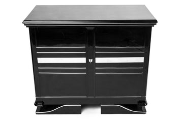 This elegant Art Deco commode features chrome lines applications and a cherry wood interior with a black piano lacquer finish.