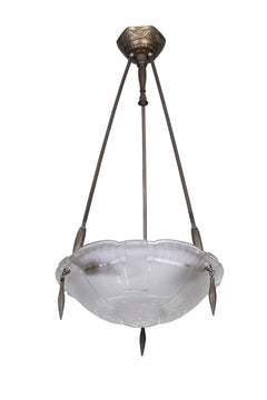 This exceptional 1920's French Art Deco chandelier designed and executed by Ernest Sabino features a beautiful floral motive frosted pressed glass shade and hardware in silvered metal. The piece is in its original condition wiring needed. Glass shade in pristine condition.