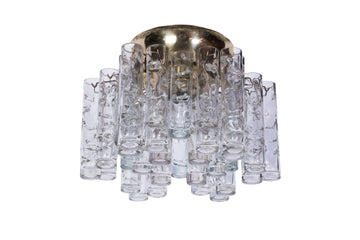 This exceptional German 1950's flush mount was designed by Doria. It features 30 hand-blown textured glass tubes cascading from a circular brass frame.