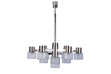 This luxe Mid-Century cubist chandelier was designed by Sciolari. It features a chromed brass frame that holds 10 glass cube shades with frosted design.