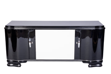 This stunning Art Deco sideboard / credenza is finished in a high gloss black lacquer with center door in high gloss white lacquer with beautiful carvings on the doors. Hardware in chrome plated metal.