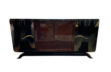 Luxe Art Deco sideboard / credenza / buffet featuring a solid Mahogany frame with center doors and sides veneered in Rosewood, side doors, top and base in black piano lacquer. The piece has two single doors with stylish brass handles and one center double door. Plenty of storage. Straight rectilinear foot. The piece has been topped with a black lacobel glass.