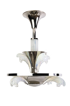 This petite 1930’s French Art Deco chandelier was designed and executed by Sabino. The frame has two (2) trumpet cascading tiers that is composed of nickel-plated metal and decorated with opalescent glass icicles.