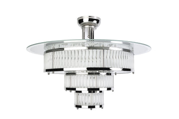 This impressive Art Deco style chandelier is made out of three tiers of chrome plated metal, frosted glass and glass rods.