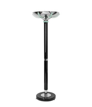 This magnificent Art Deco style torchiere features a chrome shade with frosted glass inserts finished in a high gloss black lacquer. It is in excellent condition and has been newly rewired.