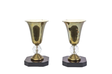 This chic pair of Art Deco urn-shaped lamps features an urn or chalice in brass with an insert in cut crystal and Makassar Ebony base.