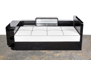 This magnificent French Art Deco daybed features an streamline design in high gloss black piano lacquer and covered with a luscious leather upholstered cushion. The piece features a display compartment with mirror back and glass shelve and doors. Side storage/ bookcase armrest.