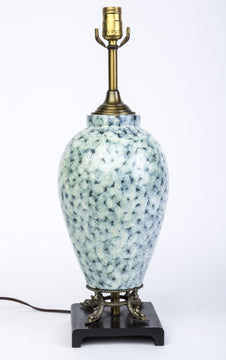 Mid-Century Modern Mosaic Porcelain Table Lamp in tones of teal with Japanese motif bronze foot and wood base.