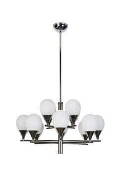 This gorgeous Mid-Century Modern chandelier features chromed brass frame that holds 12 double-layer opal glass shades distributed in two levels. Very straight light and simplistic in design.