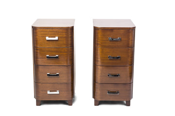 Pair of tall Art Deco streamline nightstands with four drawers in solid mahogany and nickel-plated metal hardware.