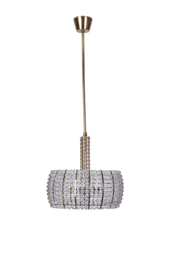 This sensational Mid-Century Modernist chandelier was designed by Emil Stejnar for Rupert Nikoll. It features a circular drum of strings of lucite pearls in a brass frame.