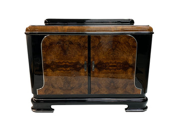 Art Deco Buffet / Sideboard in solid mahogany veneered in perfectly book matched Burl and accented in black lacquer