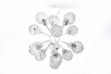 This exquisite 1960's German floral starburst Sputnik features a Pearl & aluminum frame with (13) illuminating clear crystal glass globes & (12) etched opaque accent globes.