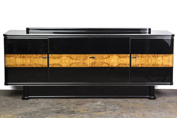 This colossal Art Deco sideboard depicts a very attractive two tone combination of black piano lacquer and Loupe d’Amboine with chrome-line details. The interior is beautifully finished in Cherry wood and burl for plenty of storage and drawers.