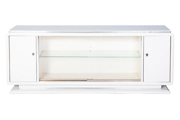 This stunning white lacquer Art Deco lowboard features two (2) swing doors to the sides, a display compartment with a glass shelf in the center covered by two (2) sliding doors.