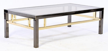 This exceptional Mid-Century Modernist coffee table features a blued steel and brass plated frame with a smoked glass top. Original condition