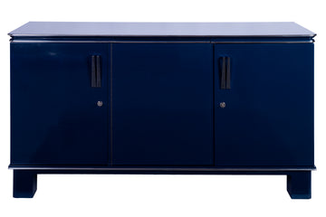 This stunning 1940's French Art Deco sideboard features a metallic cobalt blue lacquer finish with chrome detailing & fixtures. Three doors covering two drawers and a shelf on the left and a large shelf for storage to the right.