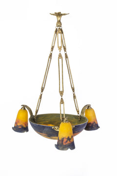 This exceptional 1920's Art Deco chandelier was designed & executed by Muller Frères. It features an ornate frame made out of bronze and brass that has been gilded, carved and polished by hand. The glass shades feature stunning hues of black, gold, and moss. It is in excellent condition and has been newly rewired.